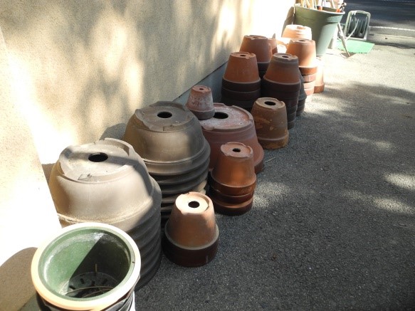 植木鉢の交換コーナーを再開します。町内の植物愛好家から、沢山の植木鉢を頂戴し、町内会事務所南の壁下にを並べました必要な方・余っている方はこのフリー交換コーナーを活用下さい。